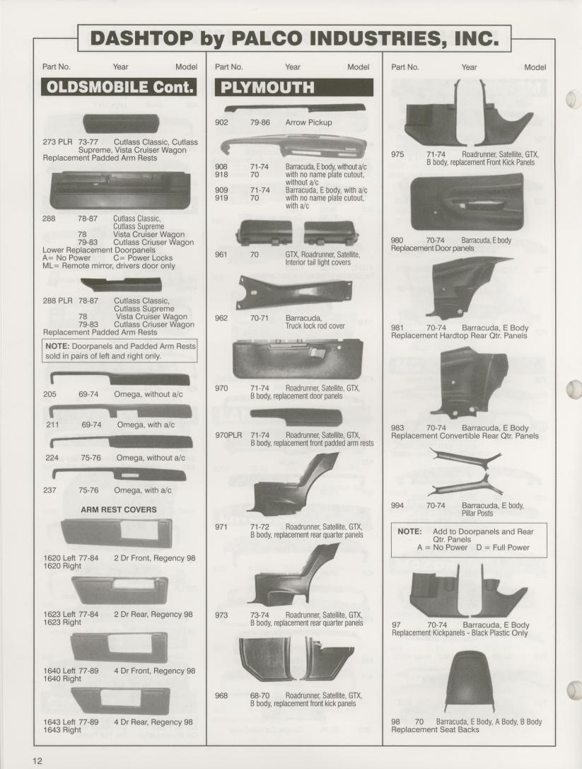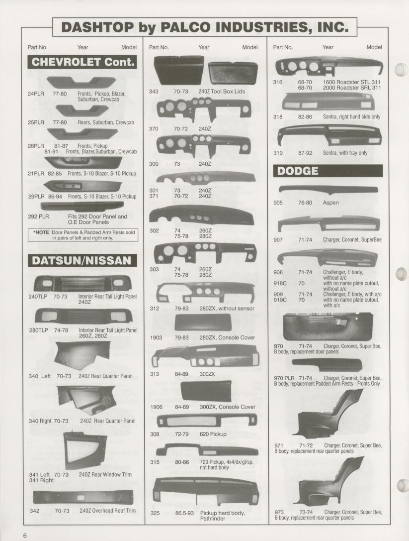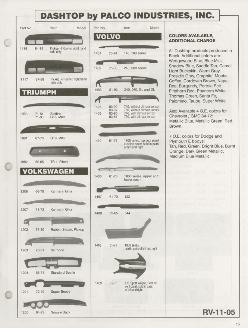 DASHTOP by PALCO Industries, Inc., develops and manufactures a large selection of molded plastic front dashboard covers, replacement arm rests, and replacement door panels. Please browse the catalog below for available products: